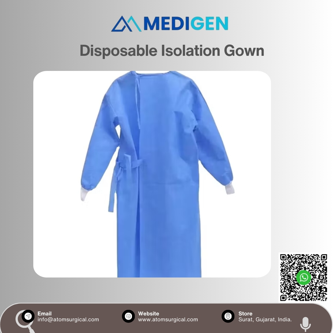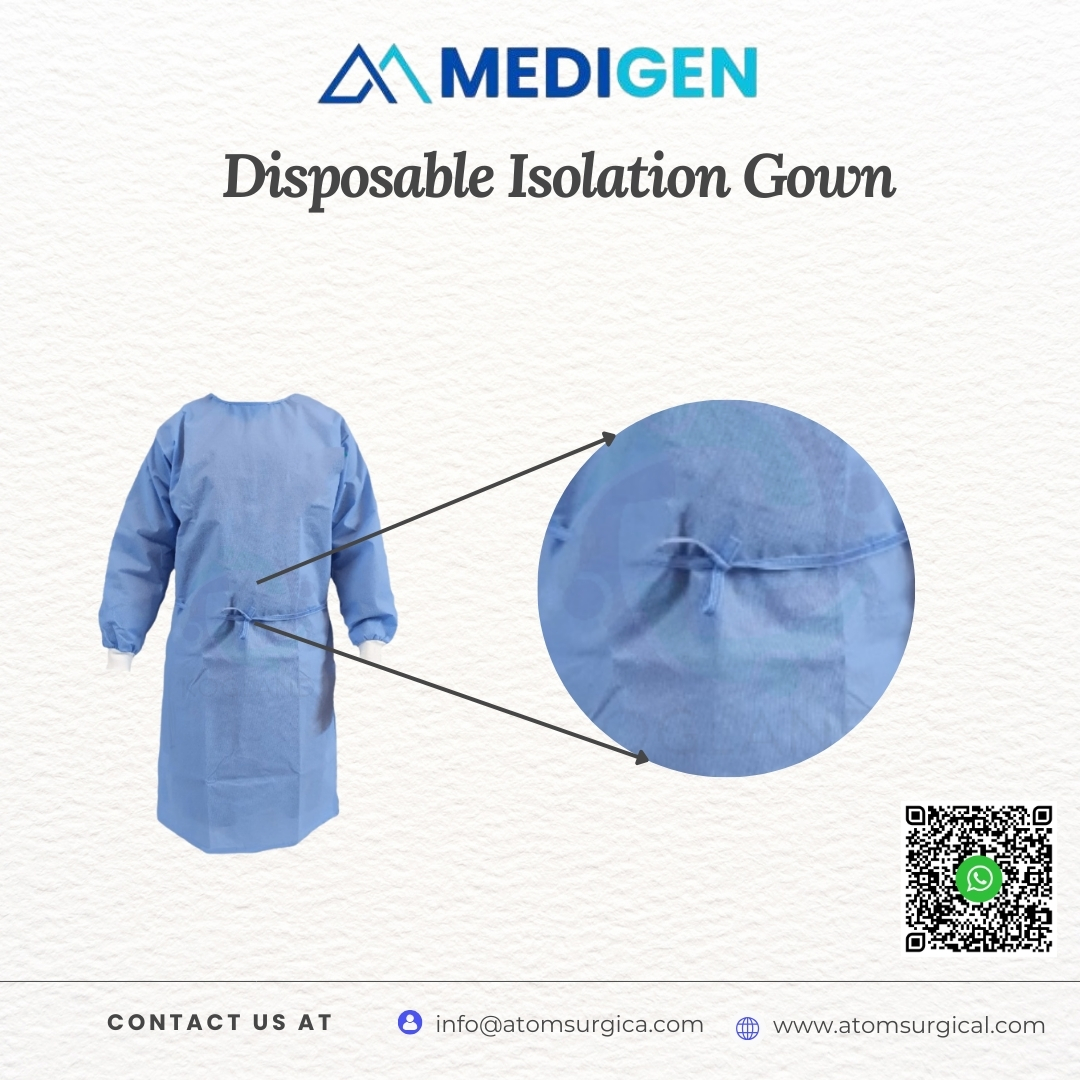 Medigen Disposable Isolation Gowns by Atom Surgical are manufactured using high-quality SMS, SMMS, or SSMMS nonwoven fabrics, offering a dependable barrier against fluids, splashes, and microorganisms in non-surgical healthcare settings.
