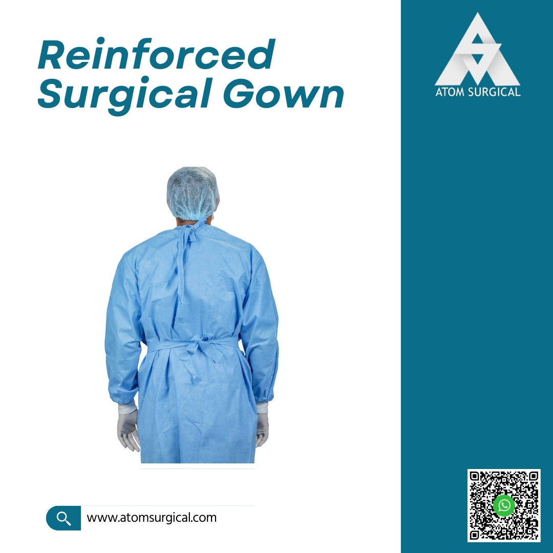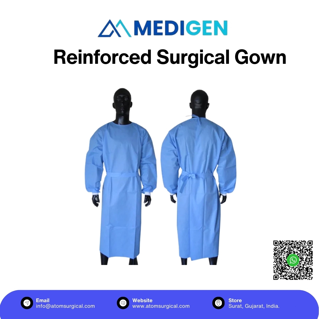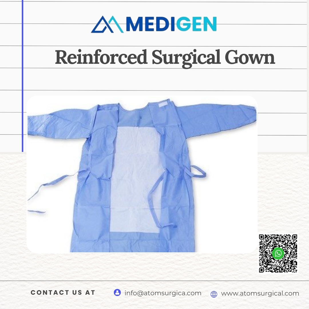 Medigen Reinforced Surgical Gowns by Atom Surgical are engineered to meet the protection demands of moderate to high fluid exposure surgical environments. The gown is constructed using advanced SMS / SMMS / SSMMS or Spunlace fabrics, with additional PE laminated or reinforced layers strategically placed on the chest and forearm areas.