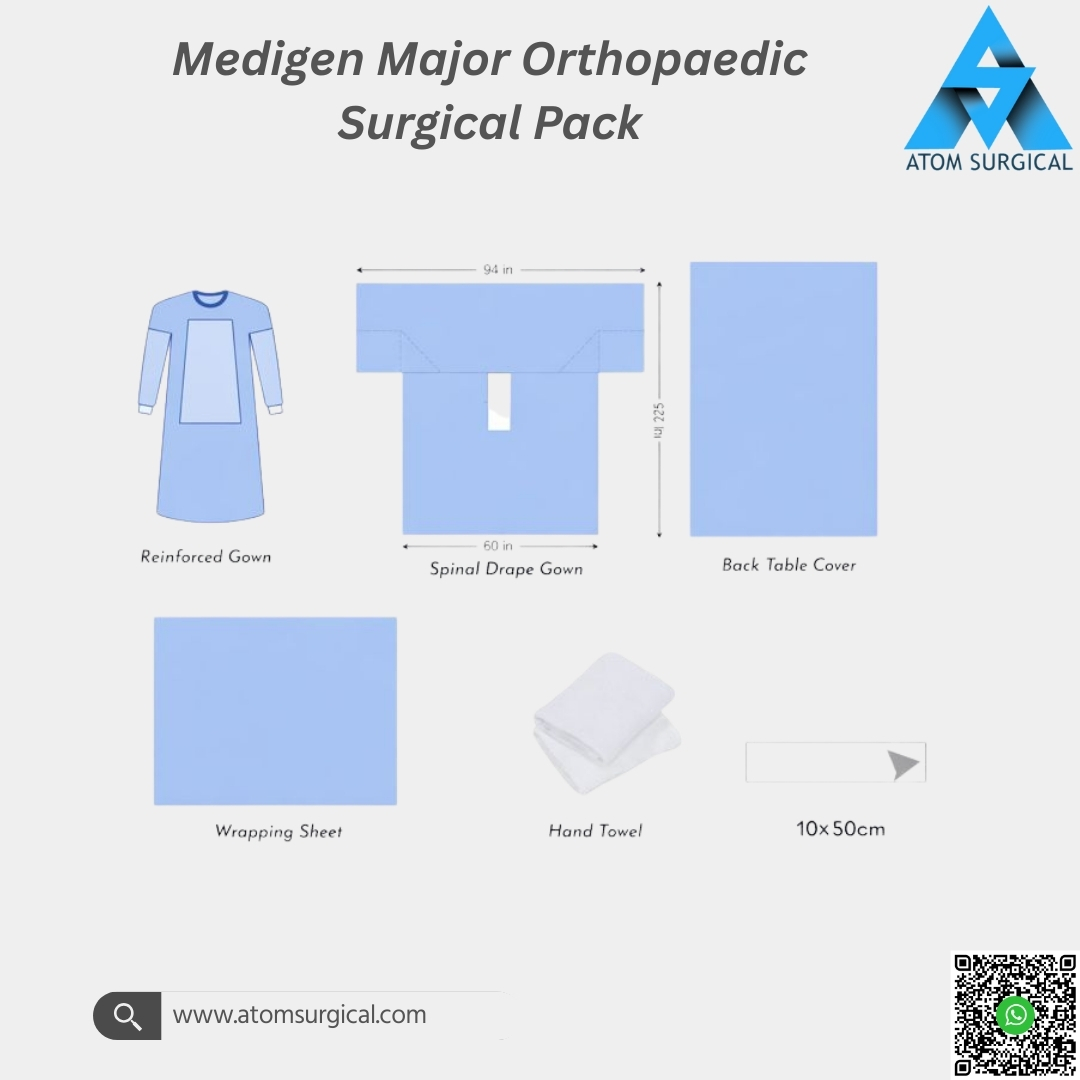 The Medigen Major Orthopaedic Surgical Pack is a comprehensive disposable surgical solution developed for complex Orthopaedic operations requiring superior barrier protection, fluid control, and procedural efficiency.
