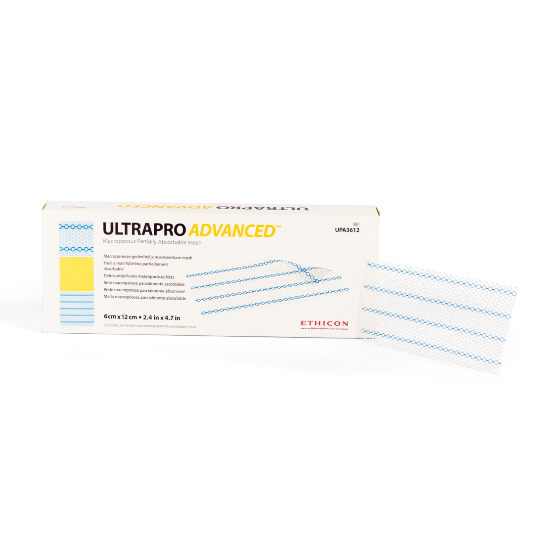 ULTRAPRO ADVANCED Mesh is indicated for the repair of abdominal wall hernias require the addition of a reinforcing material to obtain the desired surgical result. Suitability of this device is determined by the surgeon and the selection of mesh for any given patient is a function of numerous factors including, but not limited to, the patient’s past medical and surgical history, current medical condition (i.e., comorbidities), surgical technique, and size and location of the hernia. The physician is advised to consult the medical literature regarding techniques, complications, and adverse reactions before selecting a mesh.